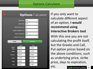 You first need to fill in the amount of money you intend to invest. Options Calculator is used to calculate options profit or losses for your trades. In this video i show you how to use the Options Profit Calculator to get an estimate of your potential profit from a Call Optiin.